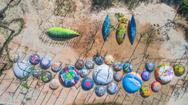 Hàng chục chiếc thuyền thúng được sắp xếp trải dài trên một con đường. Trên mỗi một con thuyền là một tác phẩm nghệ thuật với những đường nét và màu sắc khác nhau. Chủ đề chung của những tác phẩm này là tái hiện cảnh sinh hoạt, đánh cá của người dân làng chài. Tin rằng, khi xem bạn sẽ phải bật ngửa bởi chúng sống động như thật vậy.